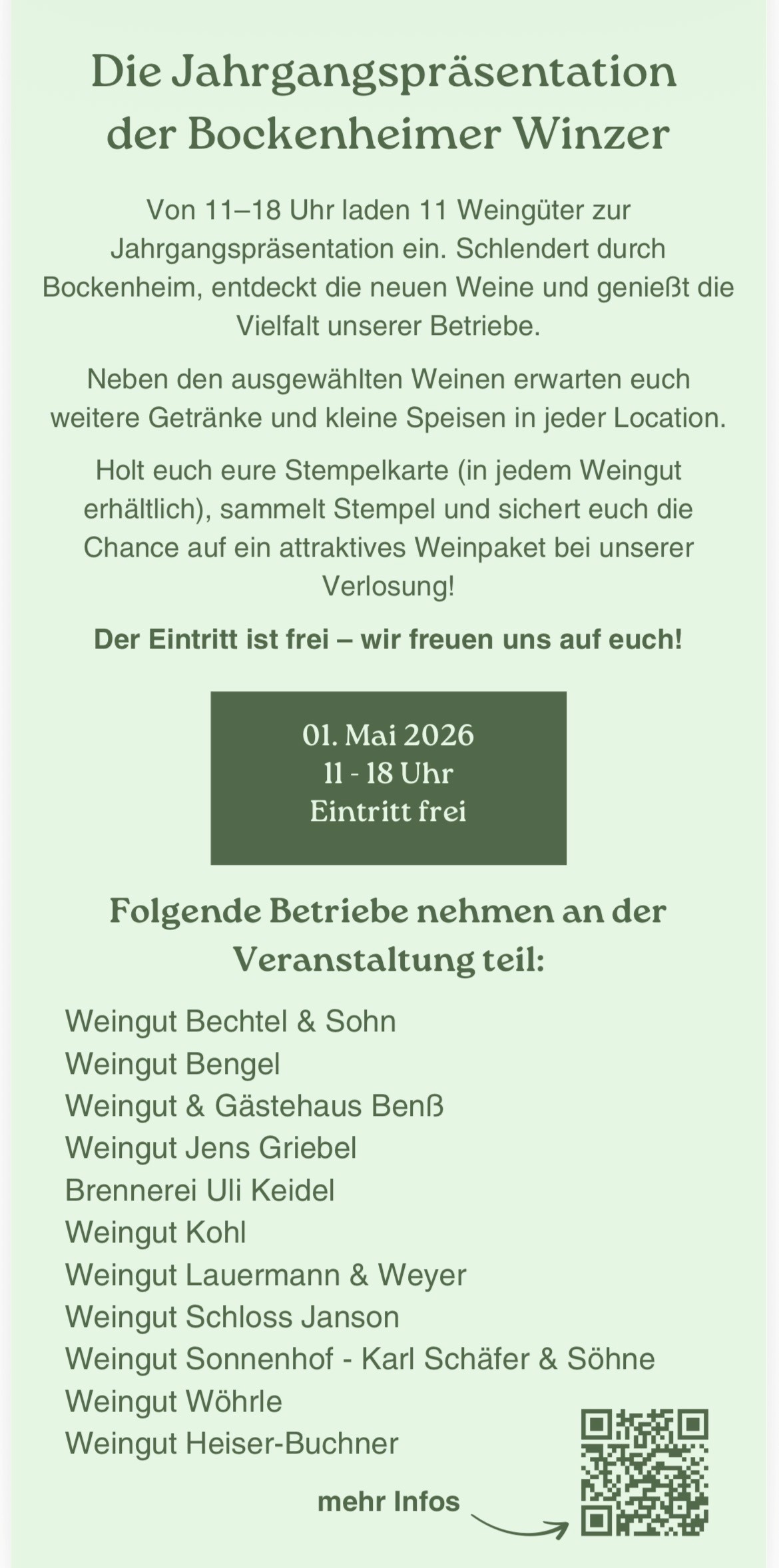 Gemeinsam mit 10 weiteren Bockenheimer Weingütern präsentieren wir den neuen Jahrgang und unser komplettes Sortiment. Probiert Euch durch, fachsimpelt mit unserem Team und findet Eure Lieblingsweine.